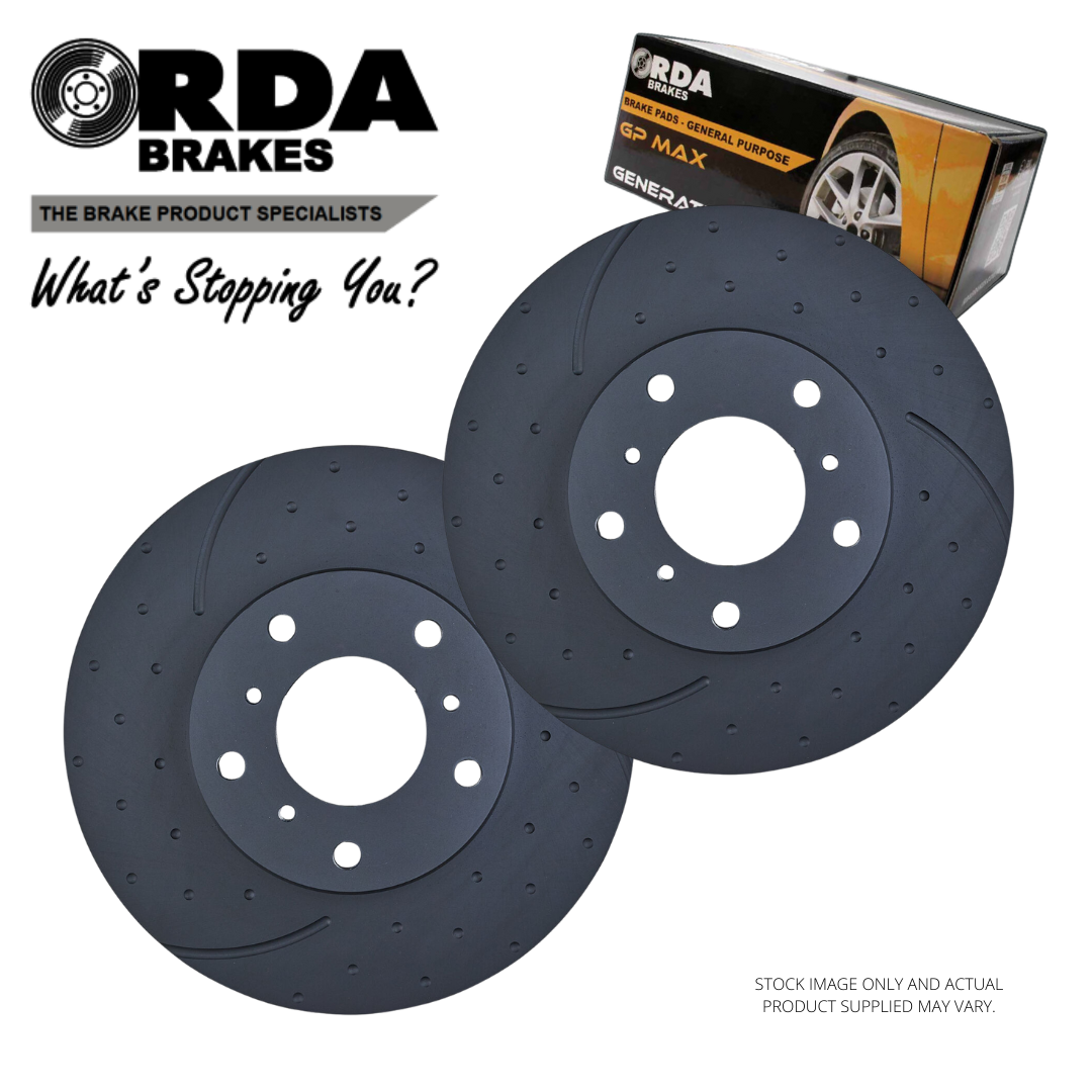 THIS PACKAGE INCLUDES 2 X RDA DIMPLED SLOTTED FRONT DISC BRAKE ROTORS + RDA GP MAX BRAKE PADS.
