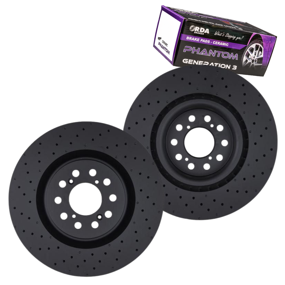 THIS PACKAGE INCLUDES 2 X RDA STANDARD FRONT DISC BRAKE ROTORS + RDA PHANTOM CERAMIC BRAKE PADS.